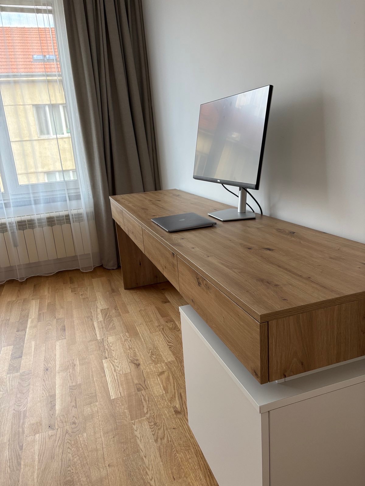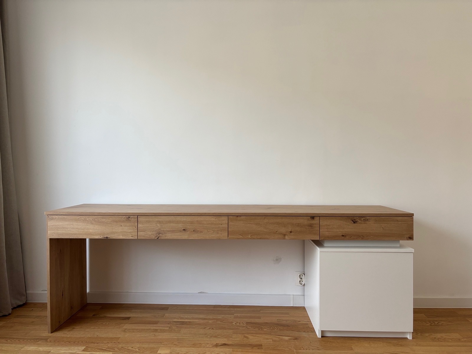 Комбинация от топло дърво и гланц, която прави работното място едновременно практично и приятно.