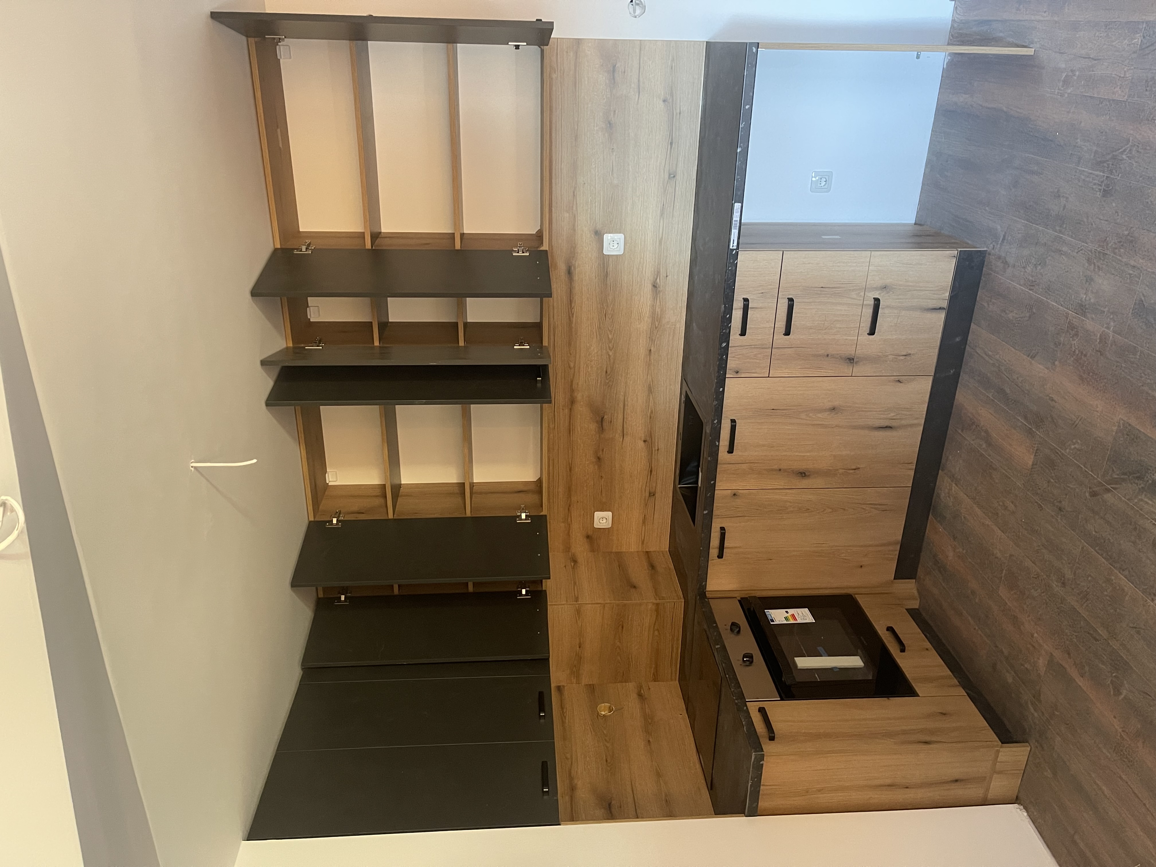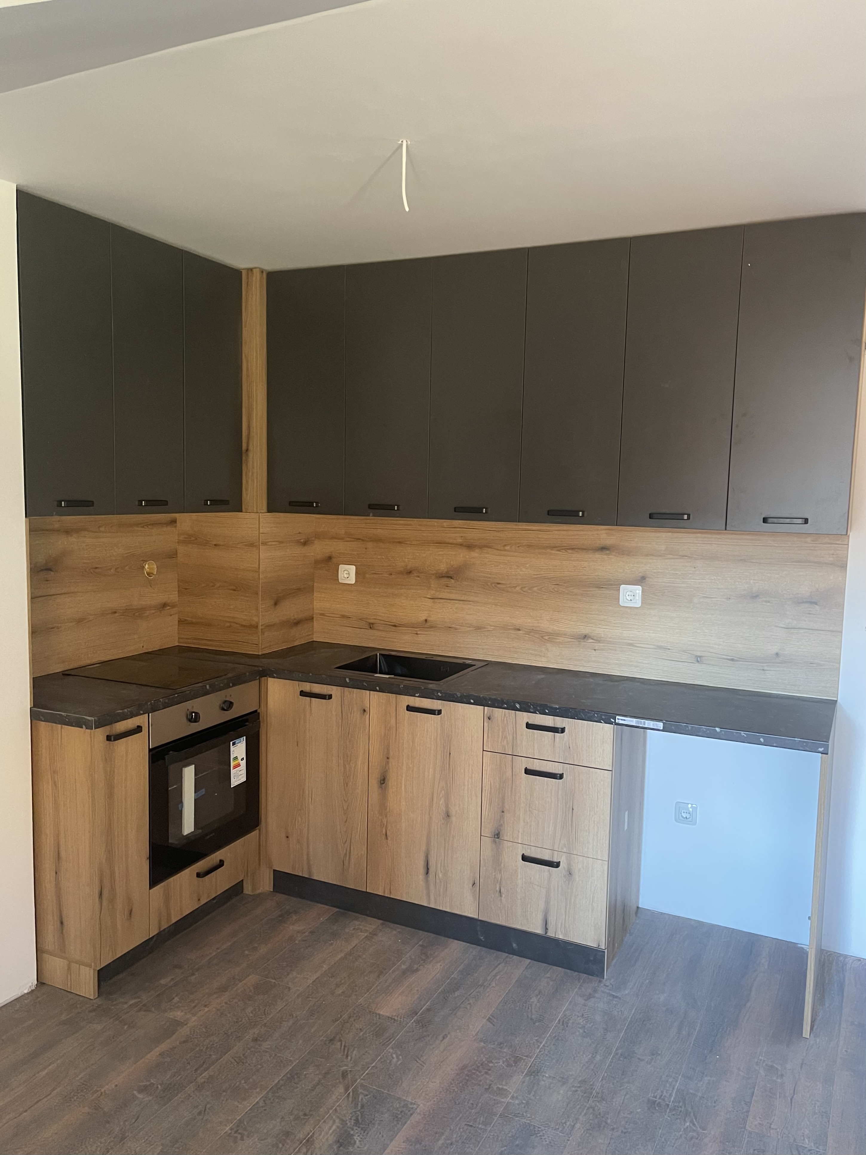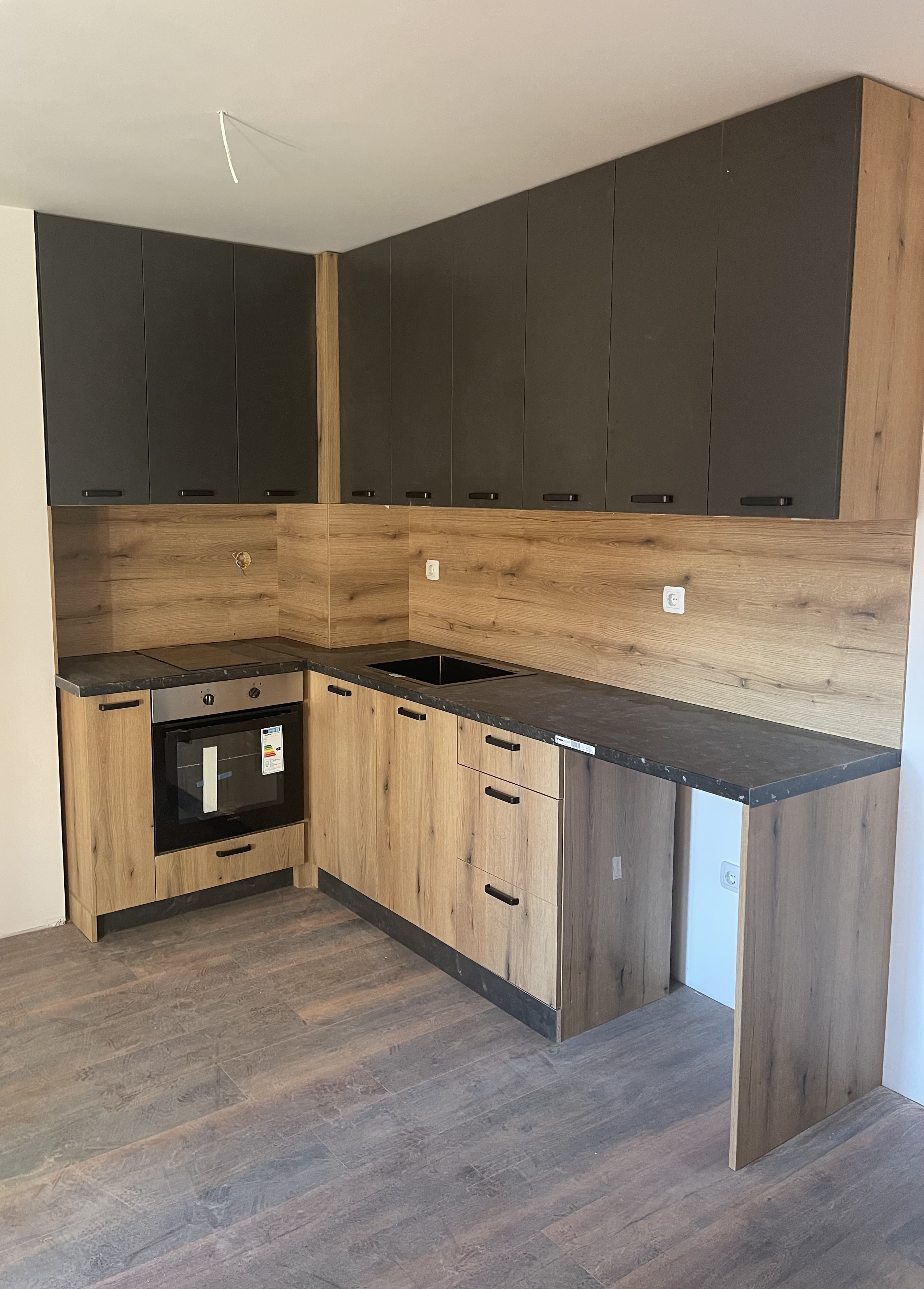 🖤 Силен визуален акцент – тъмни фронтове, подчертани от натурален дървесен декор